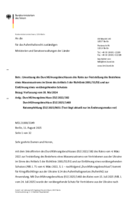 Anlässlich der Verabschiedung eines neuen Durchführungsbeschlusses durch den EU-Rat hat das BMI in einem Rundschreiben an die Bundesländer vom 11. August 2025 seine Hinweise zur Umsetzung des vorüberg